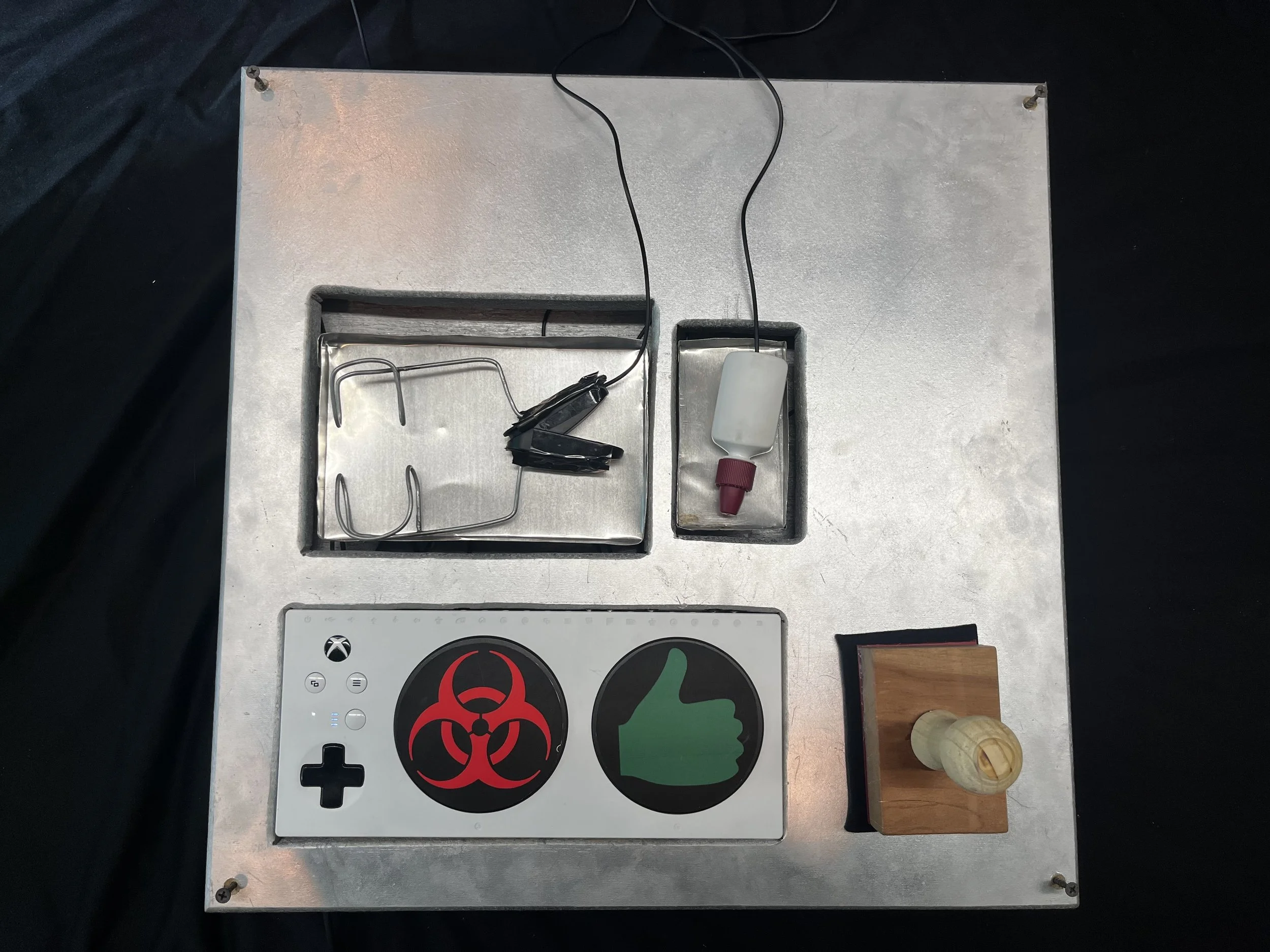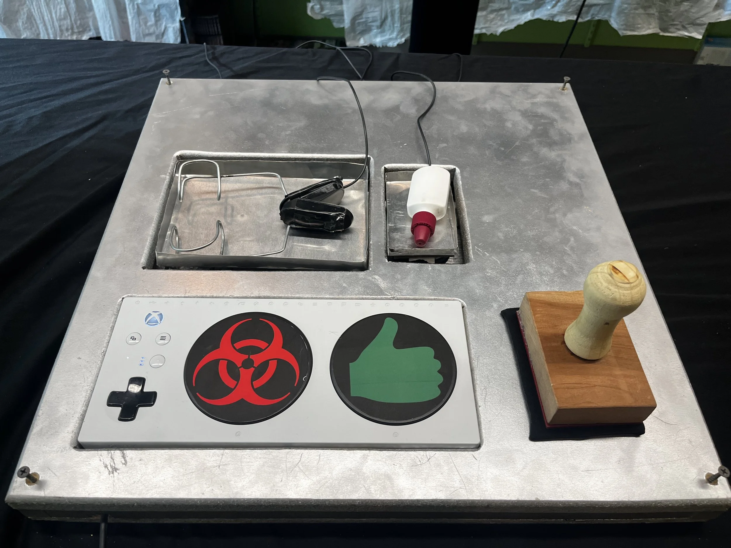 In this game, you take on the role of an eye doctor whose job is to give eye exams to patients to see if they are zombies or not. You have multiple physical tools in front of you that reflect the items in the game. You have a Speculum for opening patients’ eyes to see if they are bloodshot, and an Eye Dropper to see if their eyes dilate. After you decide if the patient is a zombie or not, you must stamp either the Infected symbol or the Accepted symbol.