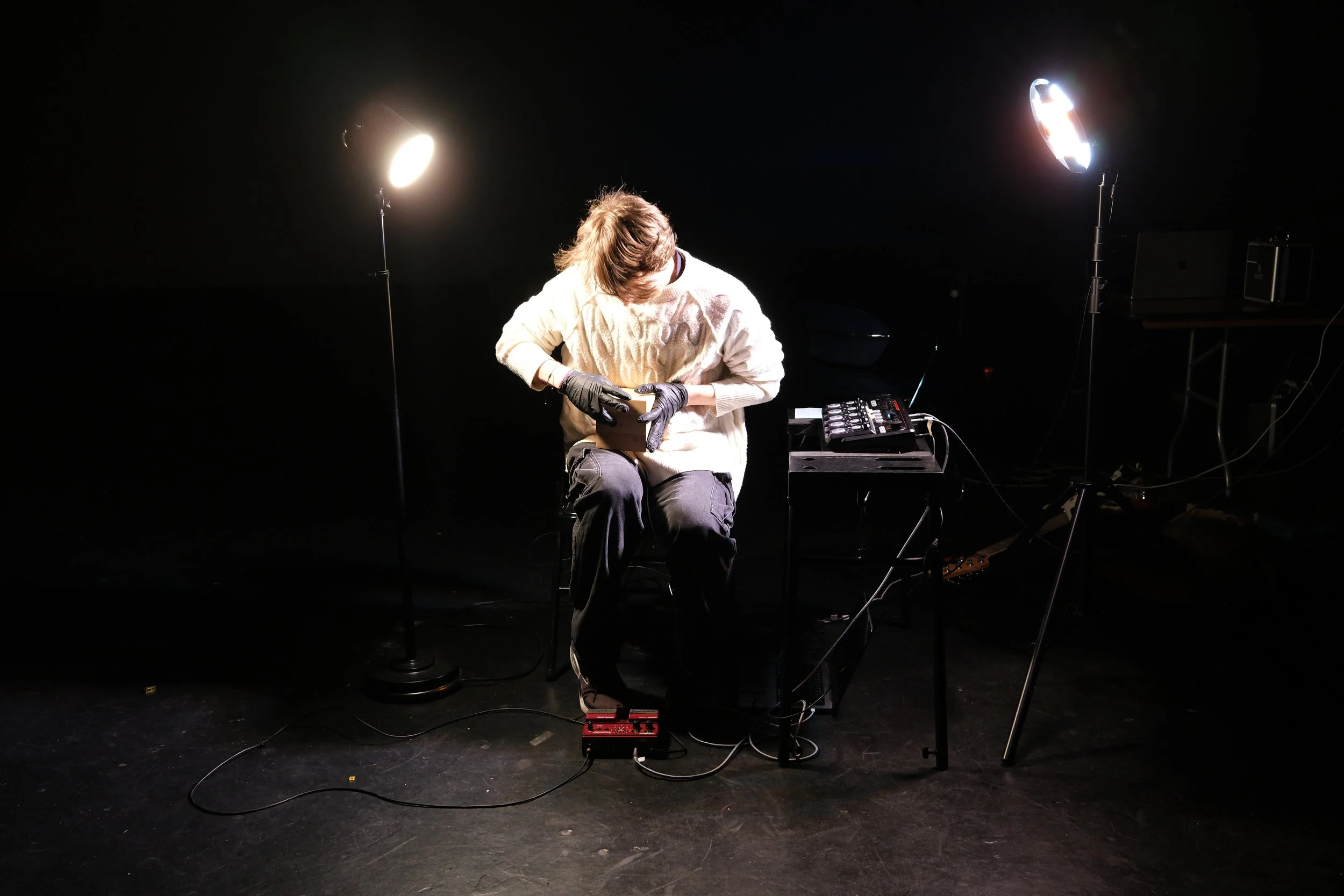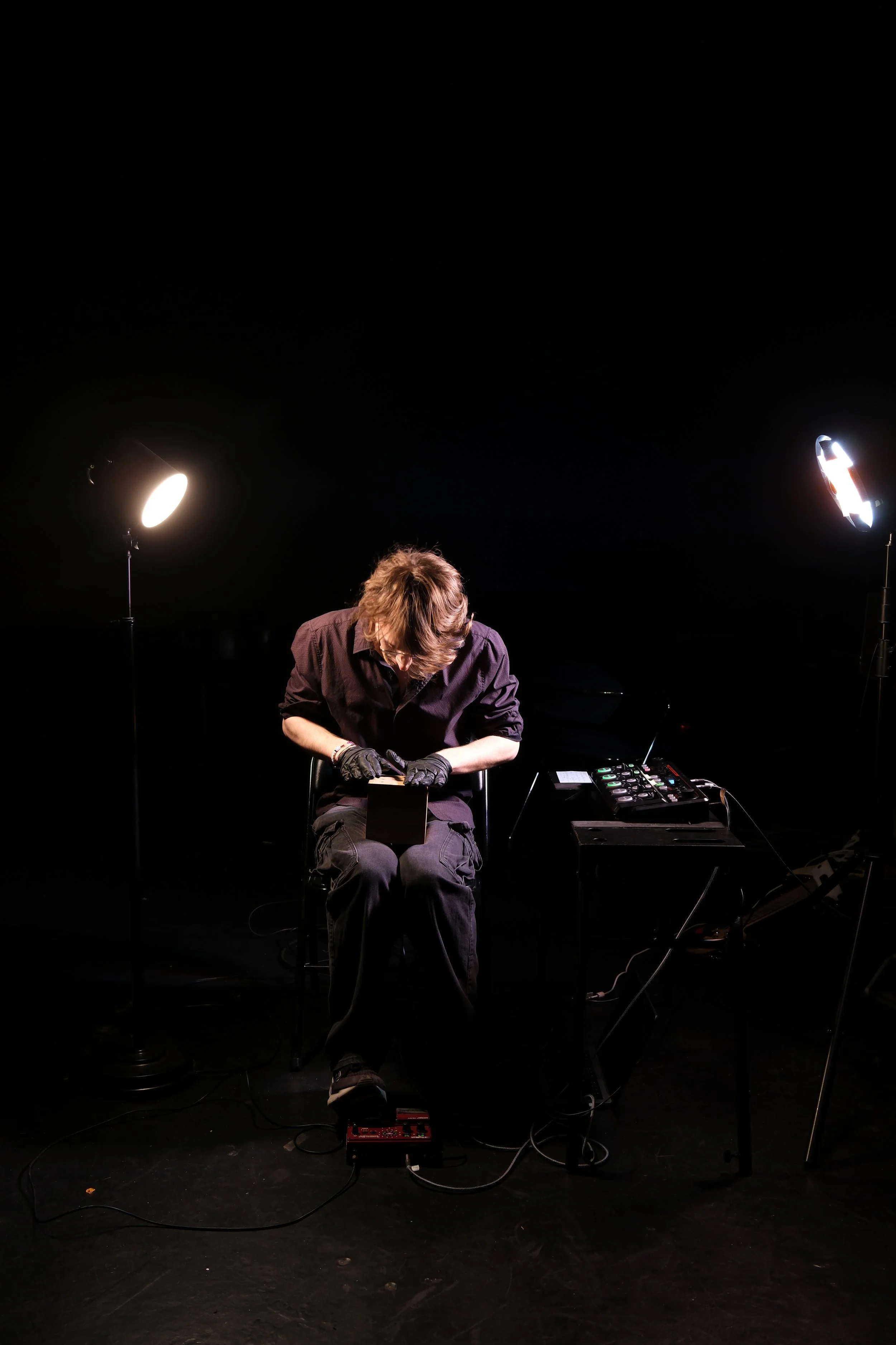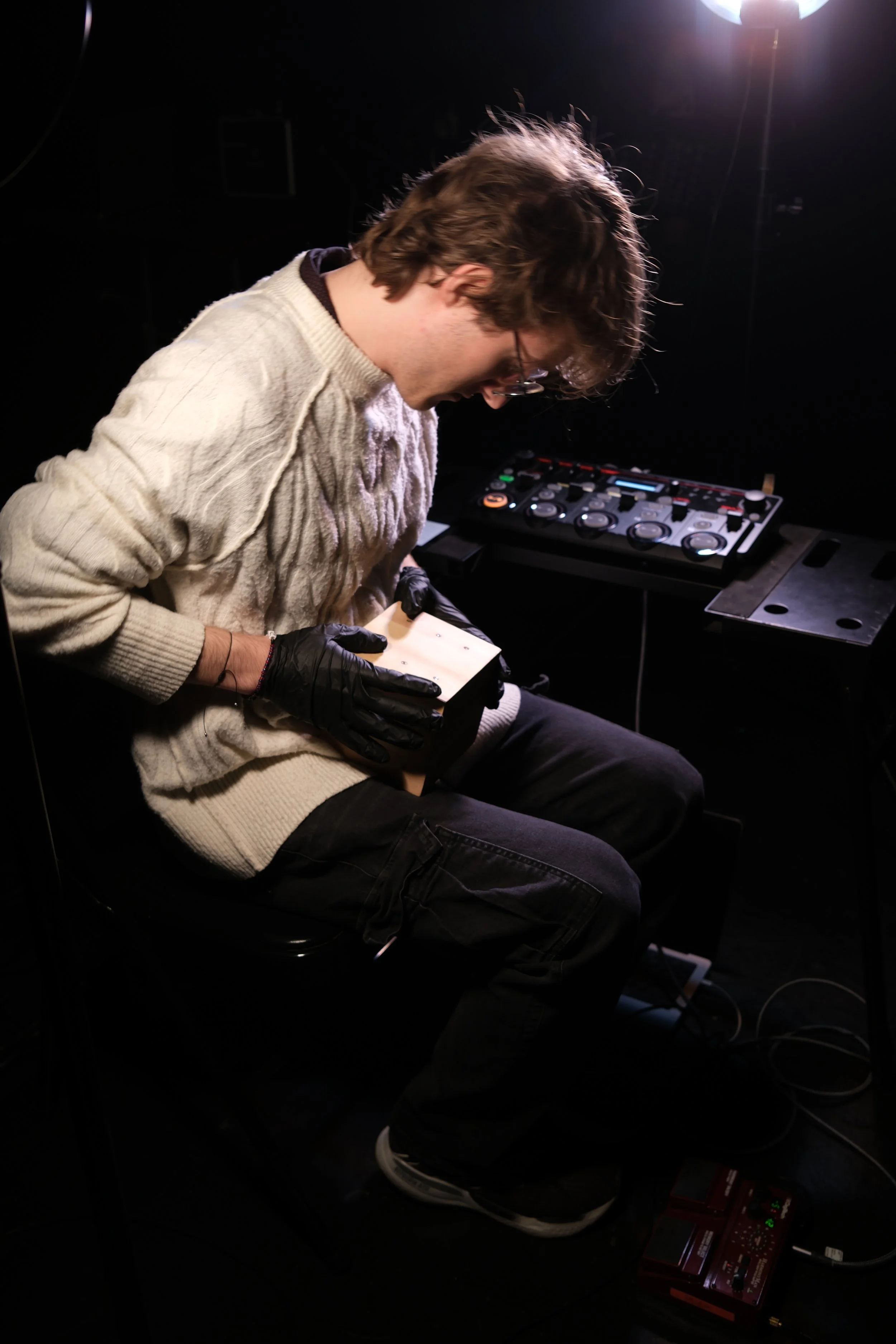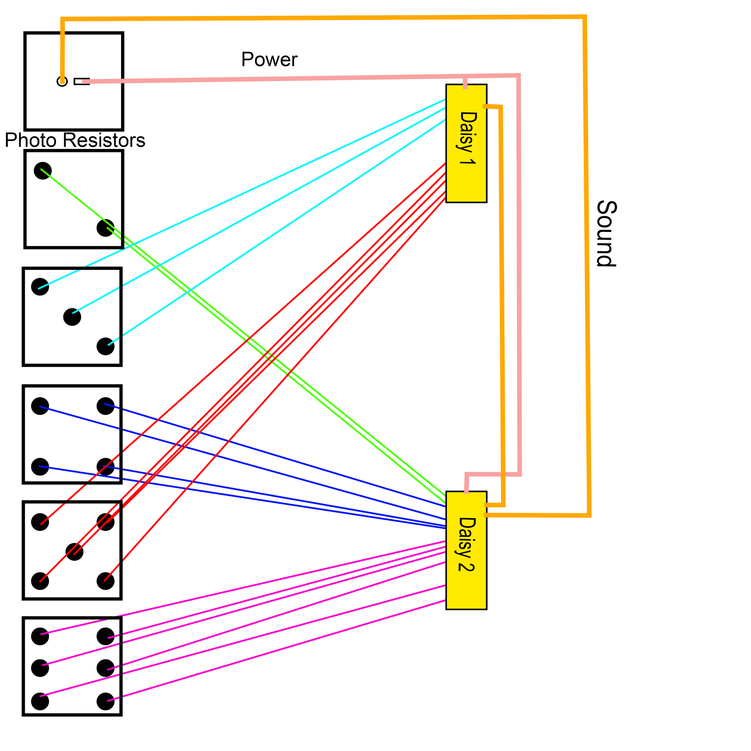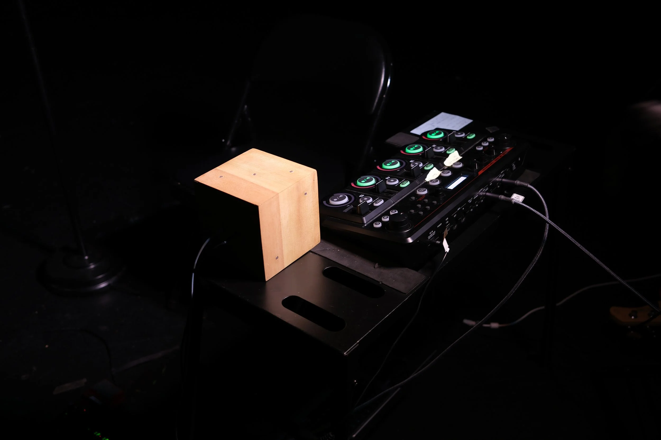 The Light Dice is an instrument that uses light sensors to create music. Each side of the dice has the corresponding number of light sensors(the 6 side has 6 sensors, the 5 side has 5 sensors, and so on). When you cover up a sensor, it will play the sound associated with it. This is a wired instrument for audio and power, but all of the sounds are self-contained.