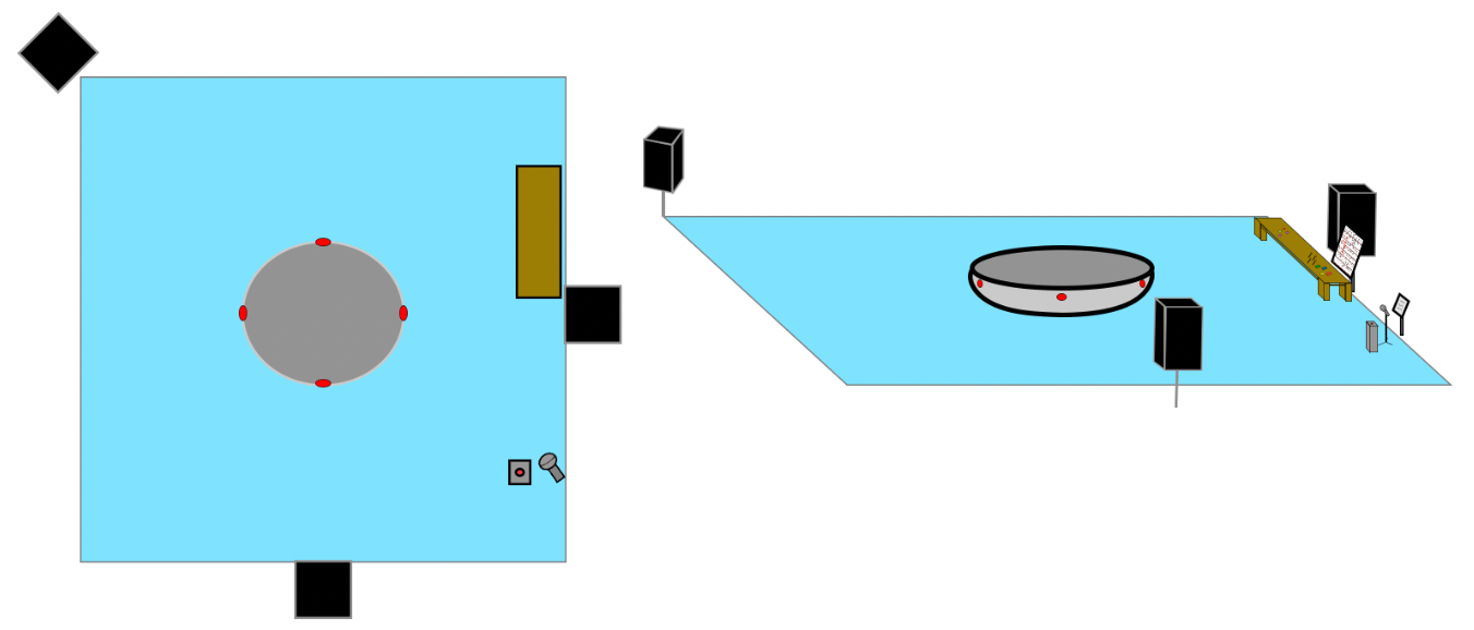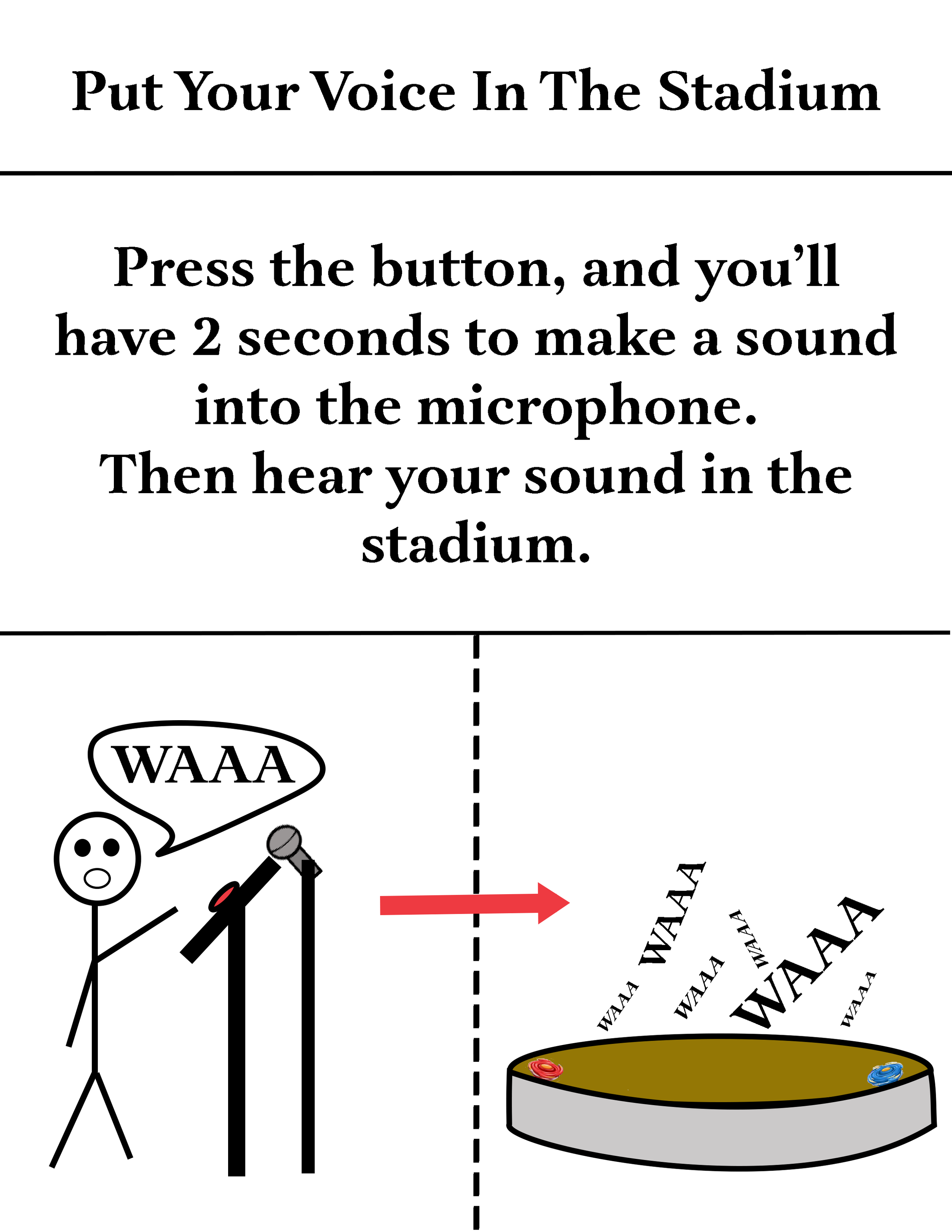 The “Musical Beyblade Stadium” is meant to make you focus on things above your line of sight. This stadium is constructed out of plaster; it is 6 feet in diameter and is over 200 pounds. Inside the stadium are 5 contact microphones, 4 around the edge and 1 in the middle. Then the sound of the Beyblades spinning around the stadium is resynthesized into new sounds and is spatialized around the room to match their movements. The 4 contact microphones around the edge play a consistent sound; the last one plays whatever sound you make into the regular microphone after pressing the button. This allows anyone to put their own voice inside the stadium.